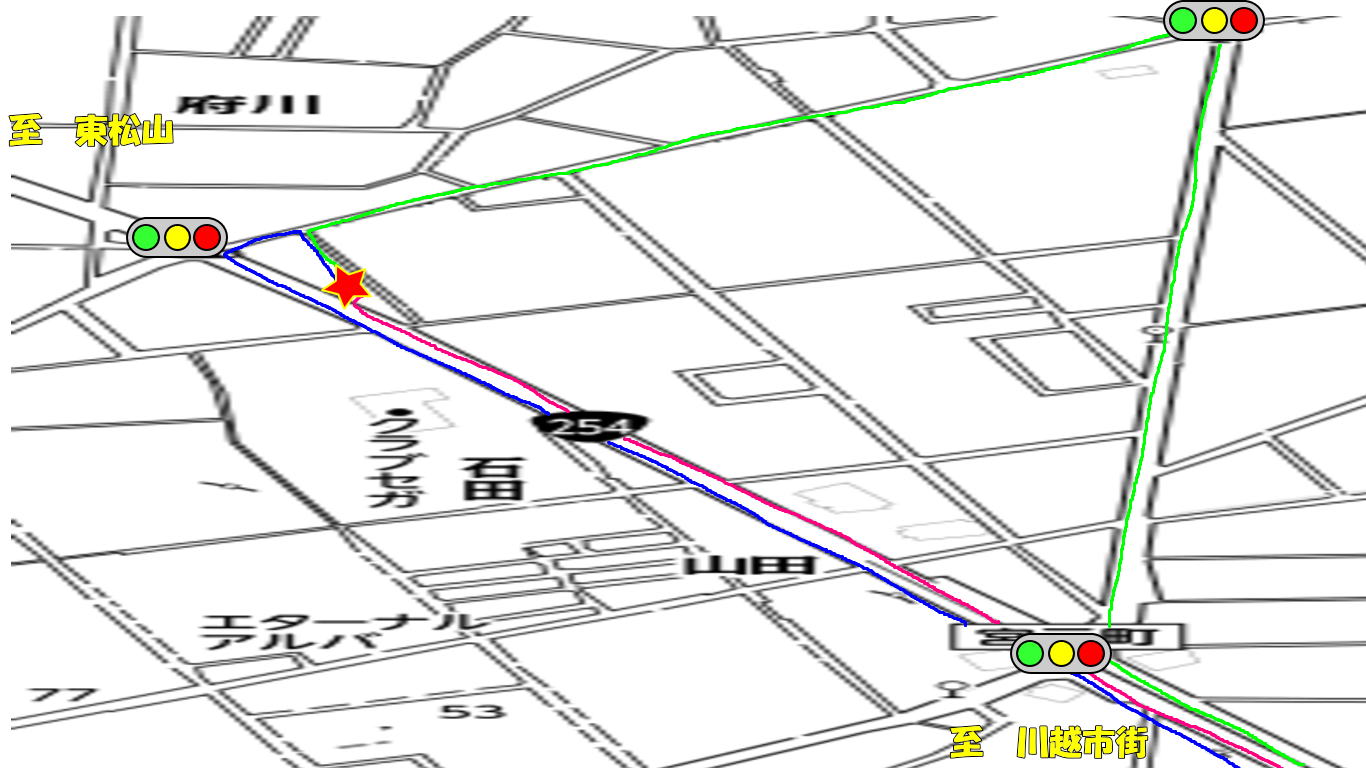 川越方面からご来店のお客様を例に、当店の駐車場への入り方を簡単にご案内します。東松山方面からご来店のお客様は直接左折でご入店いただくことが多いと思いますが、下記のように店裏側からも駐車場に入っていただけますのでご参考にしていただければと思います。